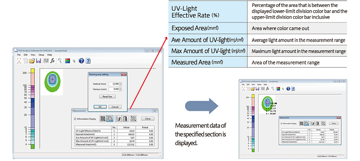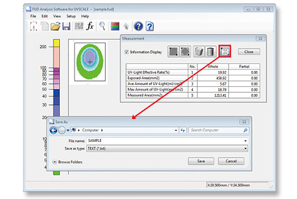 Analyzing UVSCALE images (measuring accumulated light amount, displaying light amount distribution, saving data, data export)